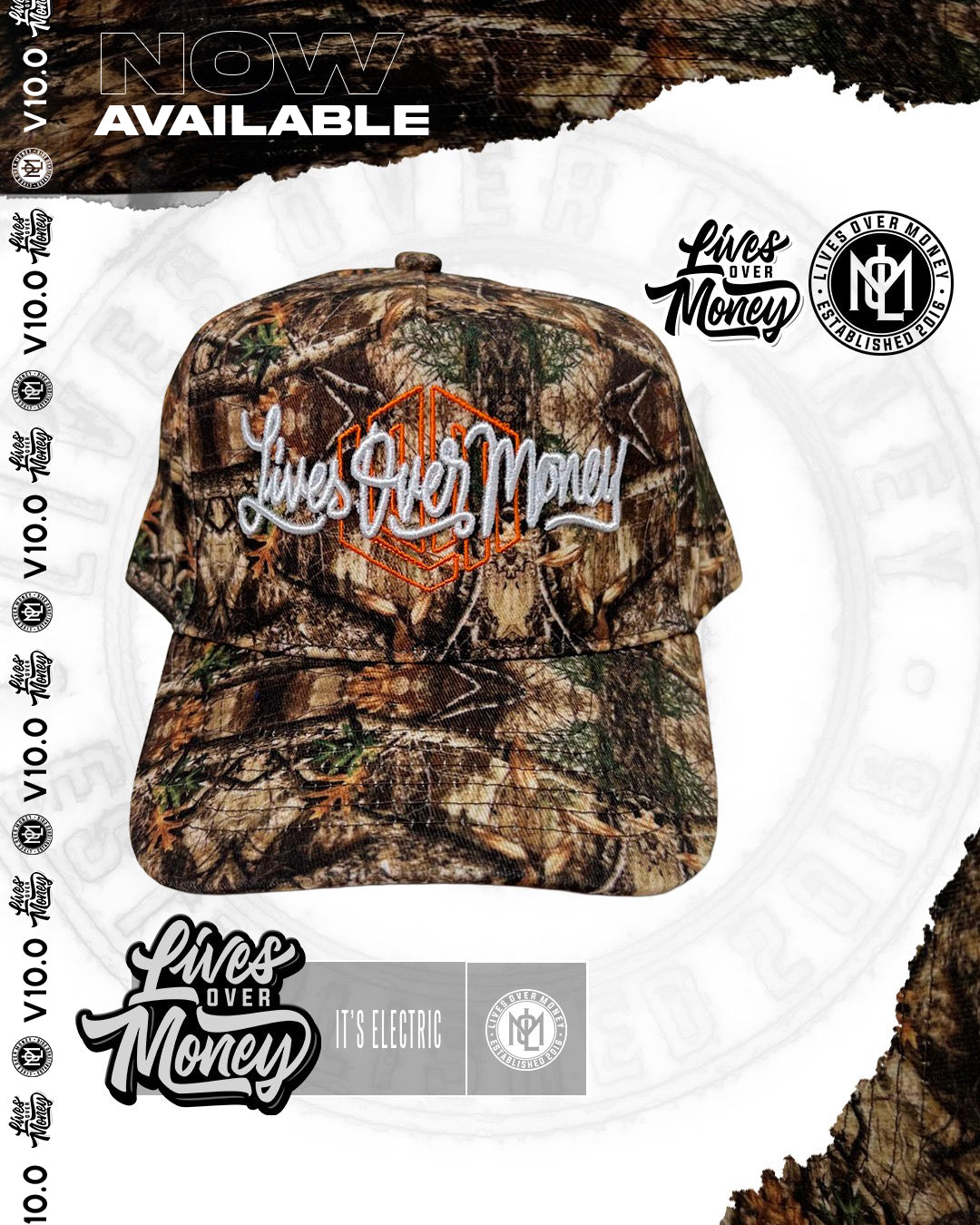 The Electric Camo Cap blends rugged outdoors energy with the signature Lives Over Money identity. Built with a full-camo shell, detailed stitching, and the bold LOM embroidery in white and electric orange, this hat is made for everyday wear — from the woods to the city.